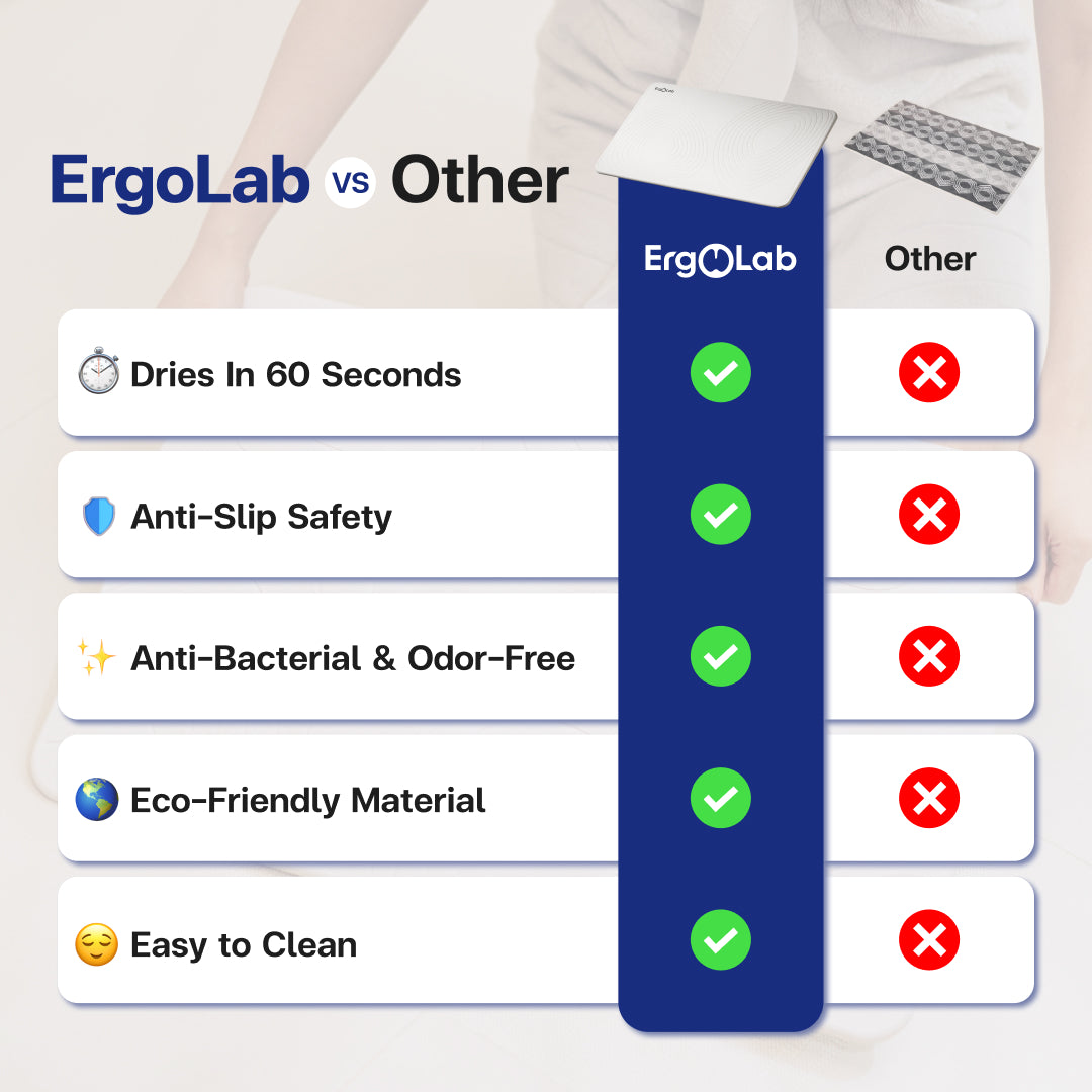 Most generic stone mats absorb water slowly, become slippery, and start growing mold after just a few months. ErgoLab is different. Our mats dry instantly, grip the floor securely, and remain 100% mold-free for years. Crafted from premium natural materials, it’s the eco-friendly choice that lasts.