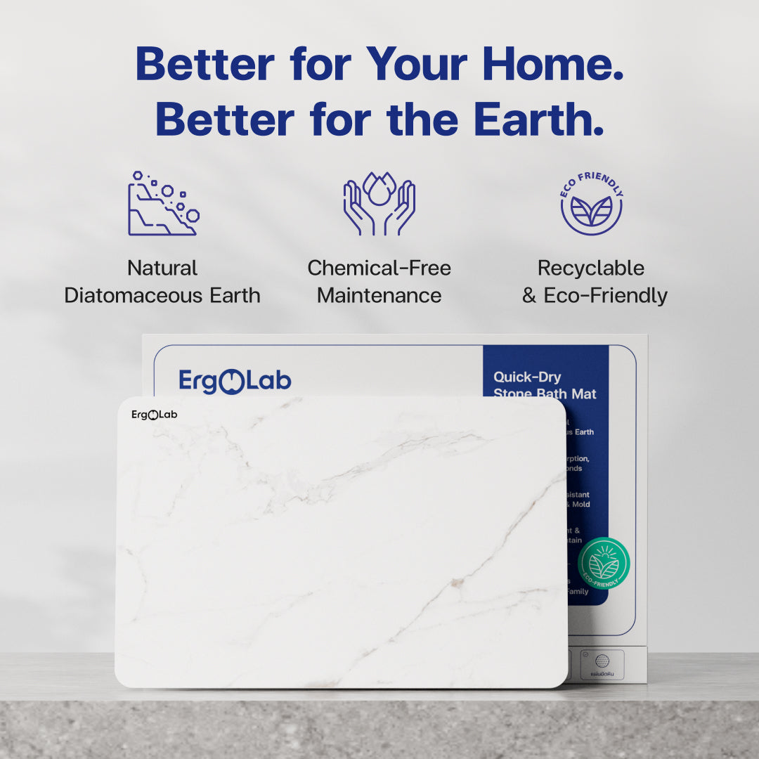 Crafted from natural Diatomaceous Earth, our stone mats are sustainably sourced, built to last, and fully recyclable. Unlike fabric mats that require constant machine washing and deteriorate quickly, ErgoLab requires zero electricity, water, or detergents to maintain. It saves energy, reduces waste, and keeps your home safe for your family and gentle on the environment.