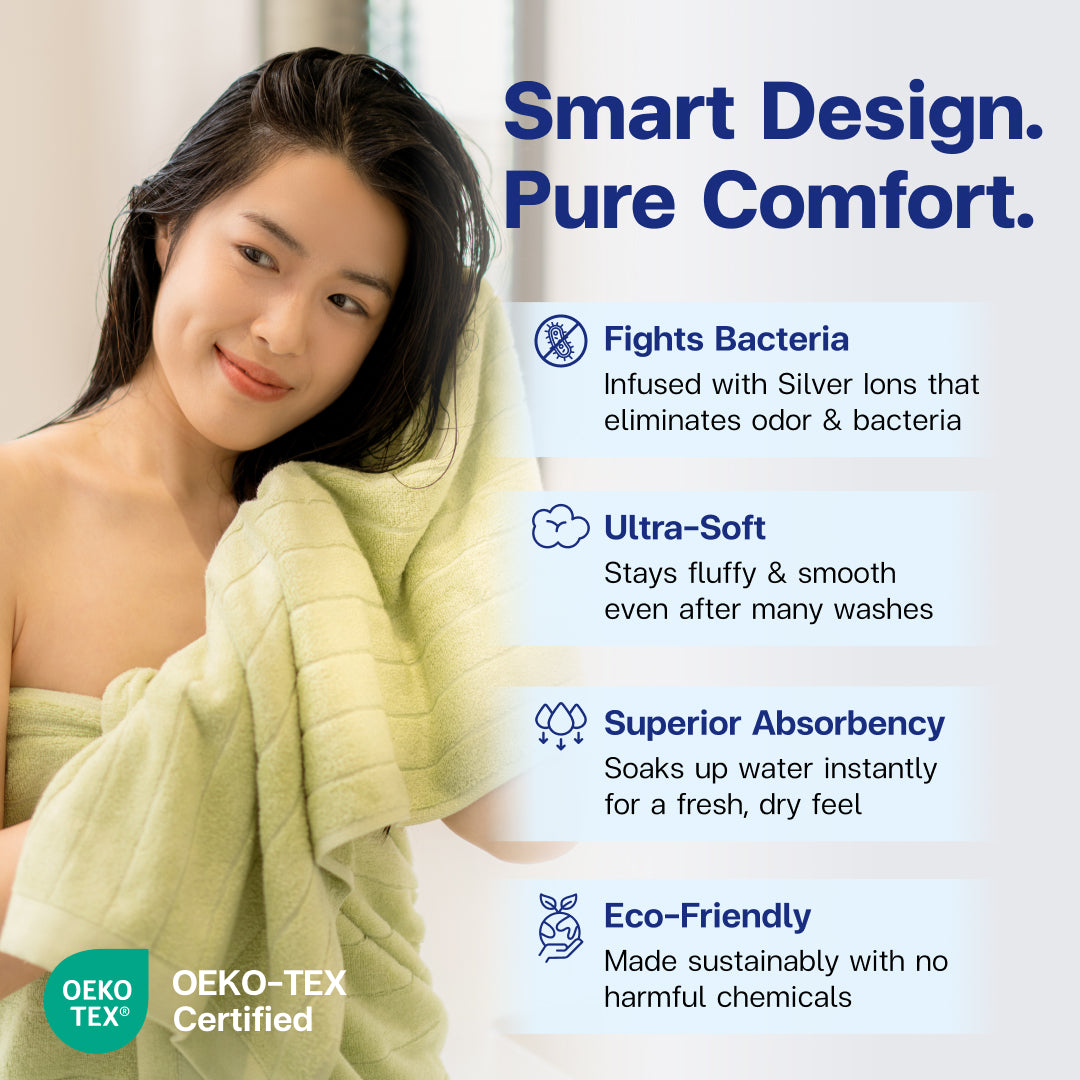 Silver ions work nonstop to inhibit bacteria growth and eliminate odors, so your towel stays clean, safe, and fresh longer - no musty smell, even in Malaysia’s humidity.